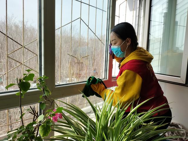 3月28日,新疆乐龄居家养老服务中心养老专干雷小路在刘香老人家里擦玻璃。 (记者梁淑芳摄)